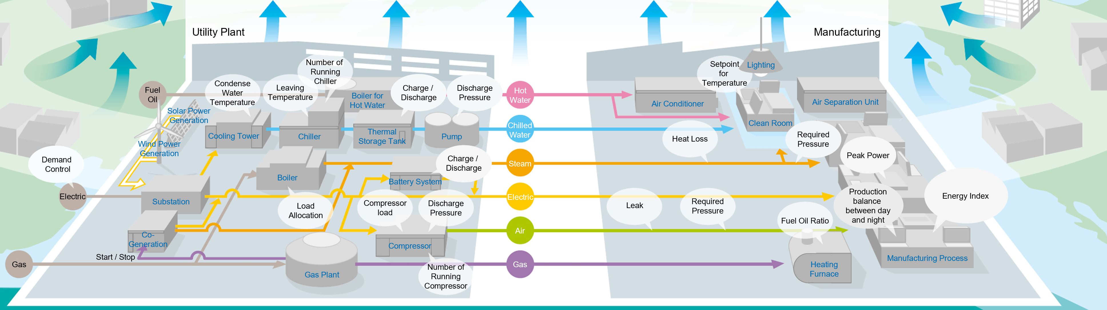 ENEOPT™- is an energy-saving improvement support system that minimizes CO2 emissions and energy costs in Utility Generation Plant and in Utility Consumption Plant.